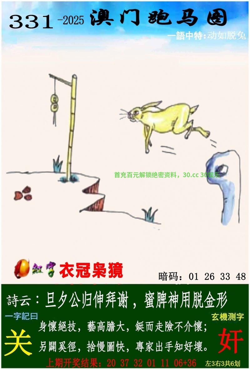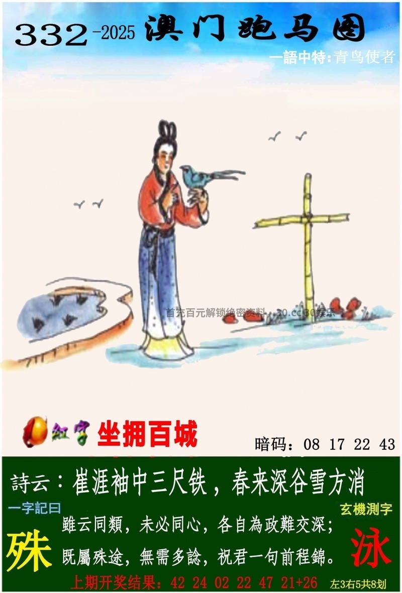| 332期:一字記曰【殊】 雖云同類,未必同心,各自為政難交深;既屬殊途,無需多諗,祝君一句前程錦。【泳】 解:祝君一句前程锦:前程锦解前肖兔牛蛇龙鼠虎 生肖:兔牛蛇龙鼠虎 |